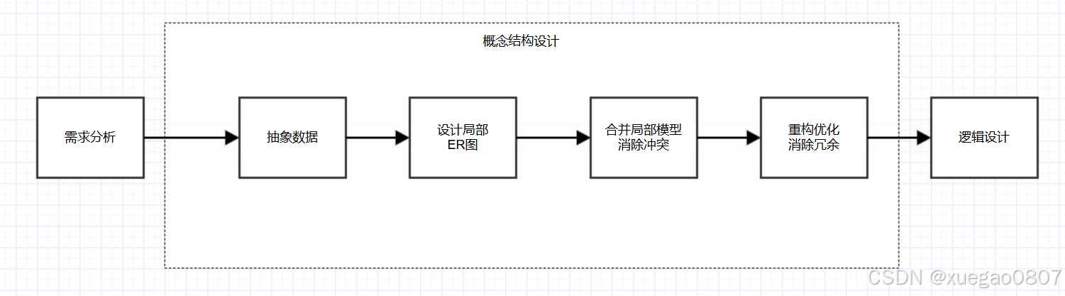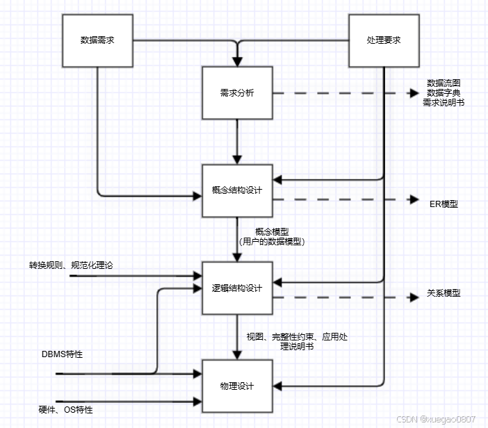 其中,虚线代表产出。即需求分析阶段生成数据流图、数据字典、需求说明书;概念介绍设计阶段生成ER图;逻辑结构设计阶段生成关系模型。