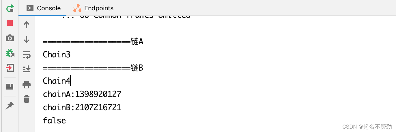 如上代码所示,定义了链A和链B,运行结果如下,chainA和chainB这2个变量,在内存中的地址引用是一样的,也就是这2个链,其实是一个对象。但是chainA定义的链1、3;chainB定义的链2、4,如果执行的话,最后链对象只能是链2、4了。