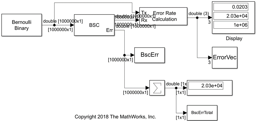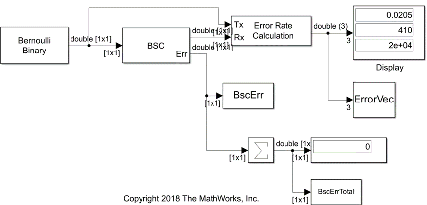 Binary Symmetric Channel模块的ERR端口每次运行时输出当次的误码数,无错为0,有错为1,因此BscErr为[20001×1]的数组。Sum of Elements模块累计每次运行时的总误码数,这种情况下要么为0个,要么最多1个,因此BscErrTotal也是[20001×1]的数组。