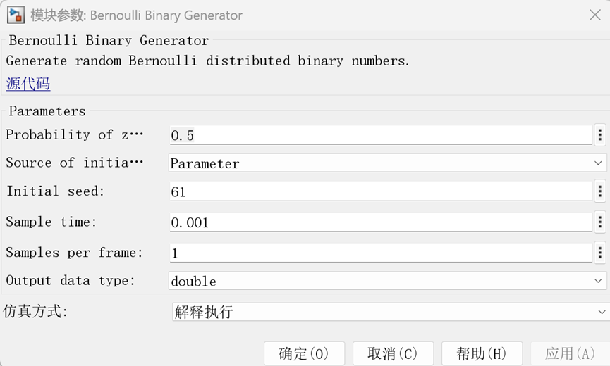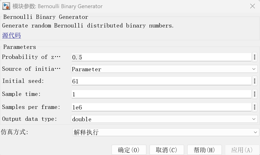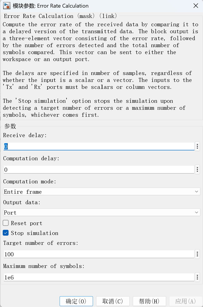 当Bernoulli Binary Generator的“采样时间”设置为1,“每帧采样数”设置为1e6时,此时相当于并行传输方式,一次同时发送106个bit(符号)并运行。另外此时Error Rate Calculation模块采用的是stop simulation模式(当下面两个条件之一有一个率先达到时停止运行),所以此时模型运行不受仿真时间约束,实际中“最大106个符号”这一条件先达到(因为并行传输,一个帧就有106个符号,实际上帧产生后模型就运行了一次)。