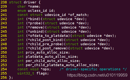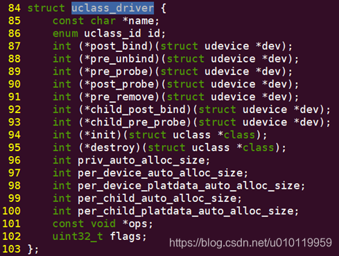 同样我们可以在uclass.h中找到struct uclass_driver的定义,这个结构体定义了一组我们访问uclass的接口: