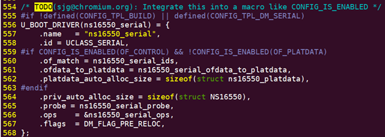其中ns16550.c为串口驱动程序,采用的是DM的框架,我们可以在源码中查看到相关的定义: