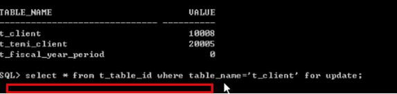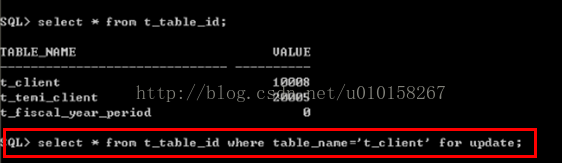 <span style="color:#ff0000;">String sql = "select value from t_table_id where table_name=? for update";</span>