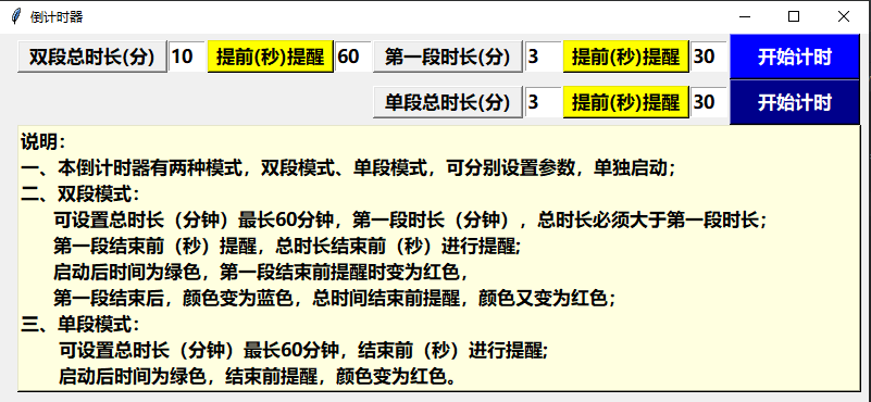 初学者一枚:网上找的例程,改了改--倒数计时器 初学python,前一阵子用到倒数计时器,感觉没有分段提示功能,就想自己练练手,网上找了倒数计时器的例程,改了改,做成可以双段计时(一般招聘时,控制总时长,以及个人陈述时长),单段计时。# coding:utf-8#from tkinter import *import turtle, timeimport winsoundimport mathimport tkinter.font as tkFontglobal sec_min,minites,entry1, entry2,entr
