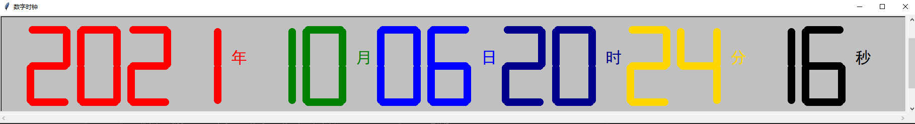 初学者一枚:网上找的例程,改了改--数字时钟 # coding:utf-8# 绘制七段数码管,显示当前时间import timeimport turtleimport win32api,win32con # win 系统#from AppKit import NSScreen # mac 系统 需要安装 PyObjC PyObjC-core# 绘制间隔def drawGap_d(): turtle.penup() turtle.fd(int(penfd/10))def init_d(): turt.
