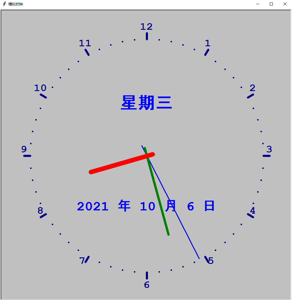 新手一枚:网上找的例程,改了改---模拟时钟 # coding=utf-8import turtlefrom datetime import *import win32api,win32con # win 系统#from AppKit import NSScreen # mac 系统 需要安装 PyObjC PyObjC-core# 抬起画笔,向前运动一段距离放下def Skip(step): turtle.penup() turtle.forward(step) turtle.pendown().