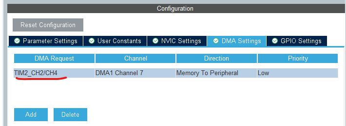 如上图,设置DMA时,DMA1 Channel7是TIM2-CH2、CH4共同的。