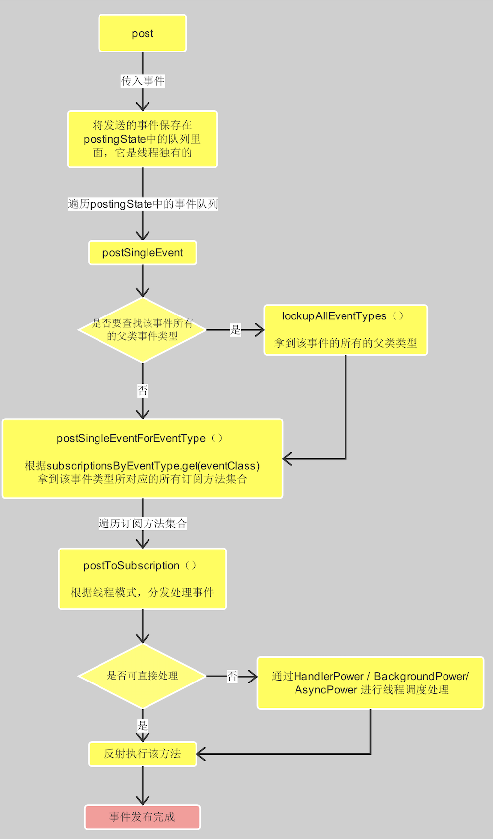 post也不难,首先是将发送的事件保存在postingState中的队列里面,它是线程独有的,然后遍历postingState中的事件队列,拿出该线程下,所有的事件的集合,然后遍历它,再根据subscriptionsByEventType,取出该事件所对应的所有订阅方法,然后看是否能够直接处理,如果能,直接反射调用订阅方法,如果不能,直接通过HandlerPower、BackgroundPower、AsyncPower切换线程后,再进行反射调用处理。