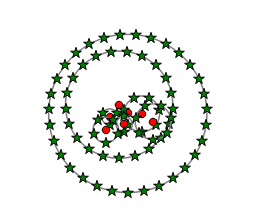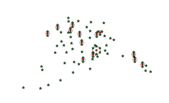不难发现,Point displacement 这个渲染样式是可以嵌入其他渲染样式的,比如上面的图其实我们是在 QgsSingleSymbolRendererV2 渲染器的样式上来添加 QgsPointDisplacementRenderer 渲染效果的。也可以指定其他的嵌入样式,作为演示,下面仅展示嵌入基本单一渲染样式的示例: