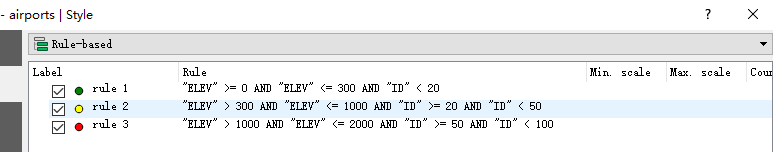 ("rule 2", '"ELEV" > 300 AND "ELEV" <= 1000 AND "ID" >= 20 AND "ID" < 50', "yellow"),