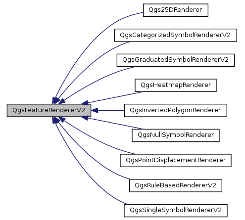 renderer=layer.rendererV2()QgsFeatureRendererV2 是一个抽象类,通过上面的代码获取到的是它的某个特定子类。它的每一个子类都对应着一个不同的渲染方式,来看看它都有哪些子类: