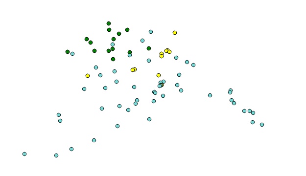 其实 Rule-based 与Gradient 非常相似,都是通过控制条件来达到分别渲染不同要素的目的。不同的是,Rule-based 更为灵活,可以指定多个字段共同来构造渲染的条件。比如,利用 QGIS 示例数据中的“airports.shp”图层,可以同时指定“ID”< 20 并且“ELEV”> 300 的要素渲染为绿色,满足某种条件“ID”在 20 到 50 之间并且“ELEV”在 300 到 1000 之间的要素渲染为黄色,“ID”在 50 到 100 之间并且“ELEV”在 1000 到 2000 之间的要素渲染为红色,这样来进行分类渲染达到的效果如下图所示:
