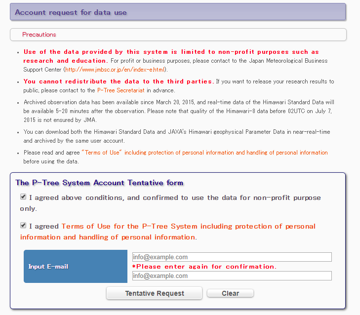 第一,本网站提供数据必须是非盈利目的,比如研究和教育,如果有商业级运用请联系Japan Meteorological Business Support Center。第二,你不能把数据分发给第三方,如果研究成果要公开,请先联系P-Tree Secretariat(就是上面的官方邮箱)。第三,自2015年3月20日起提供存储的卫星观测数据,并且在观测后5至20分钟即可获取Himawari标准数据的实时数据。 但是JMA无法保证2015年7月7日02UTC之前Himawari-8数据的质量。第四,您可以近实时下载Himawari标准数据和JAXA的Himawari地球物理参数数据,并由同一用户帐户存储。第五,在使用数据之前,请阅读并同意“使用条款”,包括对个人信息的保护和对个人信息的处理。