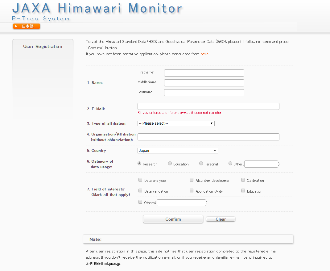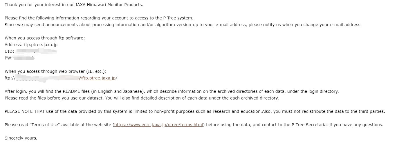 第一,在下面的表格中输入您的邮箱。第二,暂时接受的电子邮件将从P-Tree秘书处发到你的邮箱。第三,根据邮件中写的内容,转到用户信息输入表。第四,请求完成后,将从P-Tree秘书处发送申请人完成邮件。第五,在检查完你描述的应用之后,JMA将设置你对Himawari数据的访问权限。 可以下载Himawari数据时,JMA会发邮件通知。 可能需要几天的时间。第六,如果你没有收到任何回复,请联系P-Tree秘书处。