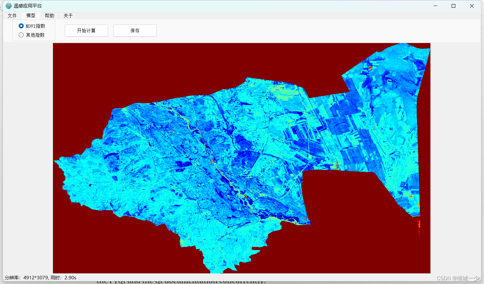 基于pyqt5实现的遥感应用软件,可根据需求进行改动。目前里面是一个NDVI指数计算的样例。逻辑与界面分离,运行时不会界面卡死。运行结果如下图所示。