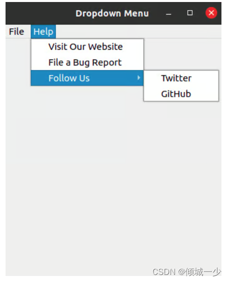 菜单是大多数 GUI 应用程序的特征。 桌面 GUI 通常在主窗口的顶部有菜单。 一些下拉菜单具有悬停时打开的子菜单。 下图显示了桌面 GUI 上典型菜单的外观。