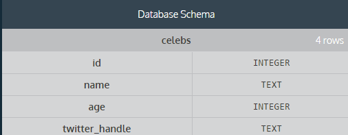 示例: create table celebs(id integer, name text, age integer);//括号中列出各字段以及各字段的类型