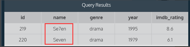 示例: select * from movies where name like 'Se_en';