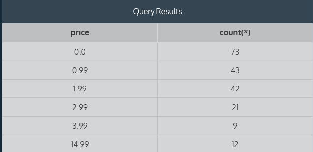 示例: select price, count(*) from fake_apps group by price;