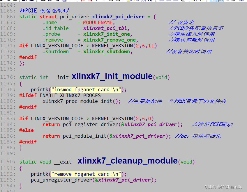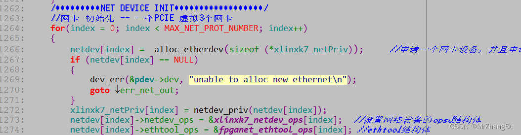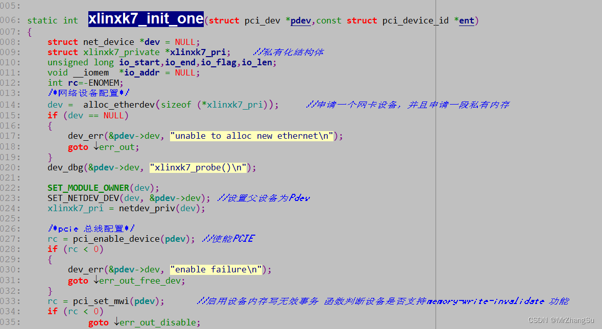 2) 实现 xlinxk7_init_one 函数,需要再函数内部初始化PCIE设备,同时注册网络设备(我是这么干的~~),DMA初始化、中断初始化,网络设备初始化等。另外网络设备还有结构体需要初始化哦,具体可网上下载其他网卡驱动源码(什么RTL8168,DM9000等,自己看看就明白了)
