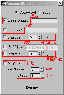 首先随便打开一个场景,或新建一个文件然后随便建几个物体,选择Tools(工具)'Rename Objects(重命名对象),弹出Rename Object窗口(如图1所示),有两种选择方式,选择select项时,仅对当前选中的对象重命名;如果没有选中物体,我们可以选择pick项,这样对调出select by name对话框,从中选择重命名的对象,选择完对象后开始命令。一个完整的名称可以由前缀+基名+后缀+增量计数组成,而且每一项都可选可不选,主要看前面的复选框是否勾选。主要命令如下。