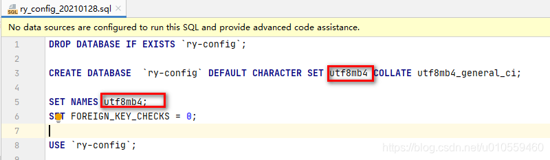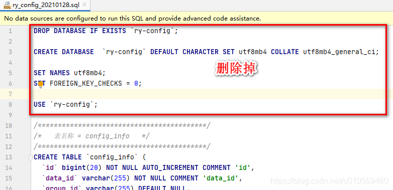 手动创建 ry-config 数据库,字符编码选 utf8, 然后把脚本中创建数据库指定字符编码的那部分删除,最后执行脚本就可以