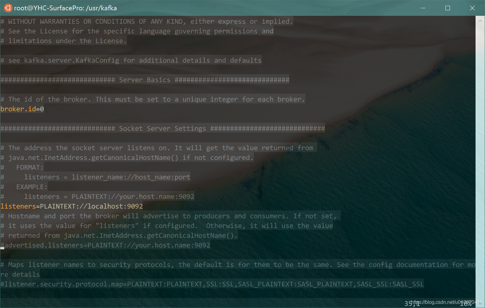 取消listeners一行注释,并修改成listeners=PLAINTEXT://localhost:9092