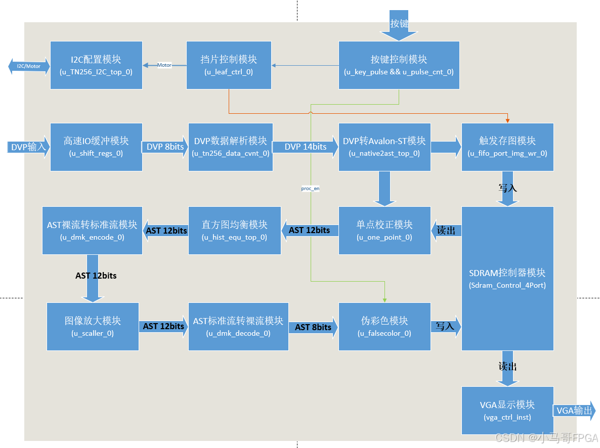 根据外部的触发信号控制进行存图,该模块主要是为单点校正算法模块服务的,目的是吧均匀背景帧数据存储到SDRAM中,作为单点校正的校正参考数据。