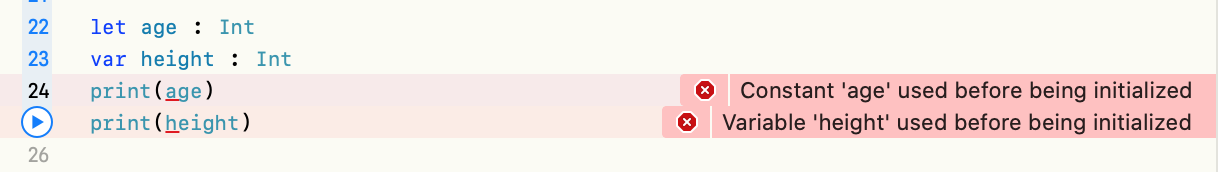 ①【常量】只能赋值1次,不要求在编译时期确定,使用之前赋值一次。let age : Int age = 10; func getAge() ->Int { return 100; } let age = getAge(); print(age);②常量、变量在初始化之前,都不能使用;