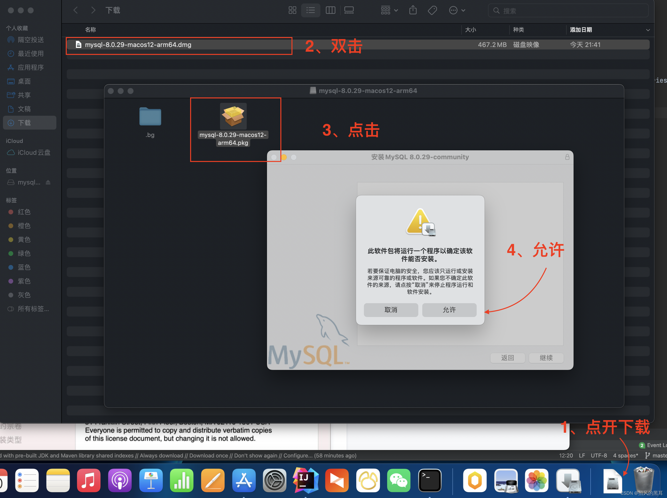 6、下载完成,在程序坞打开下载 ,如下4步操作进入程序安装阶段: