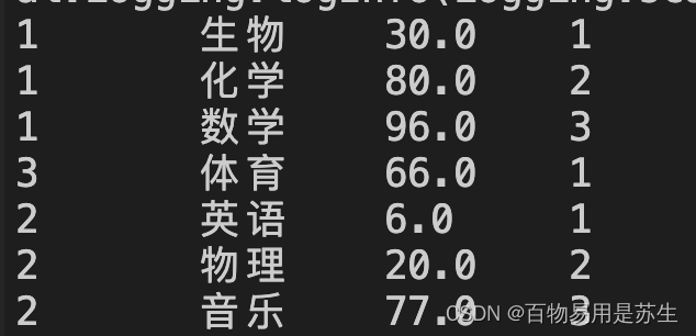 insert into std values (1,'语文',98.5),(1,'数学',96),(1,'化学',80),(1,'生物',30),(2,'物理',20),(2,'政治',88),(3,'体育',66),(2,'音乐',77),(2,'英语',6);