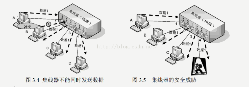 集线器又叫Hub,是一种用于“星形”网络组织的中心设备。它具备中继器的特点,端口比中继器更密集,因此又把集线器叫做端口更多的中继器。集线器是一种半双工(同一时间只能接收或发送数据,不能同时既接受又发送数据)、冲突型设备,共享带宽,放大信号的同时放大噪声,不隔离广播,不能成环,不安全,一般不建议使用。集线器工作原理如下所示。A端口给D端口发送数据时,从集线器1号端口进入的数据,会发给2,3,4三个端口,然后2,3端口发现不是发给自己的数据,所以丢弃,只有4端口的D计算机发现目标地址是自己的地址,所以就接受,发送数据以广播的形式,因此这样是一种不安全的通讯设备,容易被别人监听到数据报。同时,当A发数据的时候,B是不能发送数据的,就会发生冲突,
