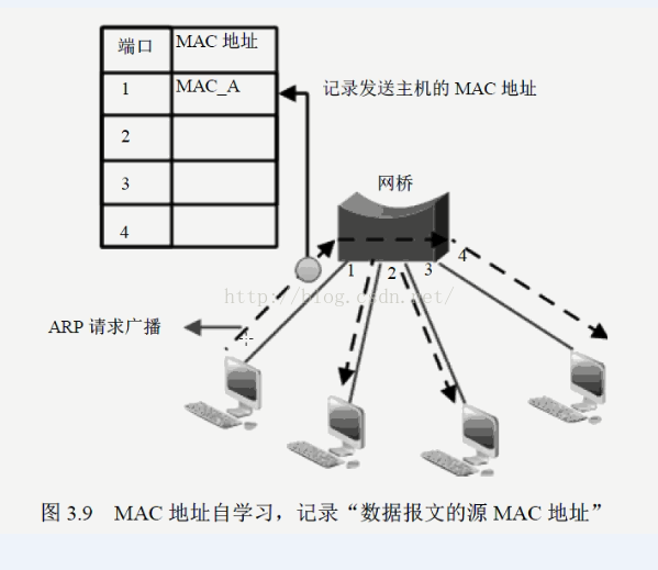 开始,网桥的MAC地址表是空的,第一次发生数据的时候不知道目的地址在哪,同样会发广播,但此时的广播不是发送数据的广播,而是一个ARP(地址解析协议)的请求广播,这个广播不带要发送的数据(即使被监听到也是不能得到主机间通信的数据),是一个轻量的广播,可以忽略不计,这次广播的目的在于建立MAC地址表,记录源MAC地址对应的网桥端口。例如这样一次广播过程:A要给D发送数据,A先ARP广播D,A作为源主机,网桥记录了A 的MAC地址,B和C收到后不做反应,然后D收到广播后单播方式回应ARP,D回应的时候对于网桥就是源主机,就会记录D主机的MAC地址,这样就完成了一次记录。请求当MAC表构建后,网桥不在进行广播,而是利用MAC表进行快速选路并转发,所以就算网桥上装有数据分析仪也不能监听到数据,监听到的广播也是不带主机间通信的数据,而集线器每次都以广播的形式发送数据(直接将数据广播出去),所以不安全。(网桥广播和集线器广播有很大区别)