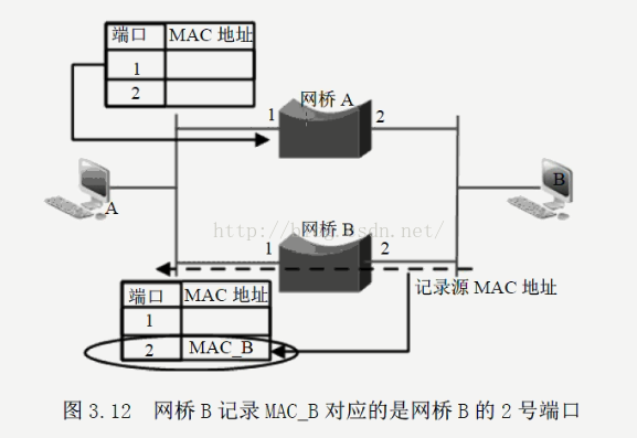 对②进行解析:当主机B给主机A发送数据时,网桥B的2端口会记录主机B的MAC地址,而在网桥环路中,网桥不隔离广播,对于ARP的请求广播,网桥B又相当于一根线,所以广播会穿过网桥B到的网桥A,即主机B发送的数据会直接到网桥A的1端口,因此网桥A的1端口也会记录主机B的MAC地址,但是网桥A的1端口连接主机A,应该记录主机A的MAC地址,所以就产生了错误。但实际情况中,网桥是物理成环的,以提供冗余的路径,这又违背了网桥不能成环的原则,所以后面会讲到一种生成树协议STP来解决这个问题。