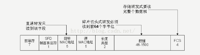 碎片切头式:这种方式集成了上面两种方式的优点,不需要读完并缓存整个数据帧,但也不是只读目标MAC地址就转发数据帧,而是在转发前先检查数据帧长度是否够64字节,如果不够,则认为是“残帧”(因为以太网介质访问发生冲突的帧,一般都小于64字节)。因为转发速度和容错率在两者之间,所以别广泛应用。