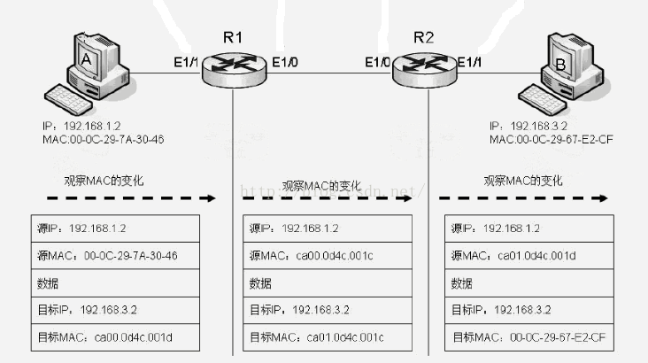上面描述路由器的工作原理的过程仅限于在第三层(网络层)中进行讨论,但一次完整的通信是不能脱离数据链路层工作环境的,当然路由器也包括在内,所以在这里会对路由器转发数据包时,数据链路层的MAC地址变化过程做补充说明。在路由器执行路由的过程,数据包的目标IP地址和源IP地址始终保持不变,但在不同路由环境中对应的MAC地址是随时变化的。