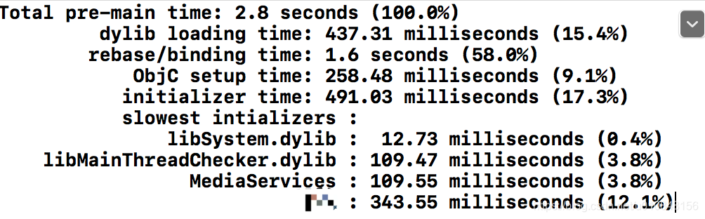 - 在2.8s中,加载动态库用了437.31ms,指针重定位使用了1.6s,ObjC类初始化使用了258.48ms,各种初始化使用了491.03ms。