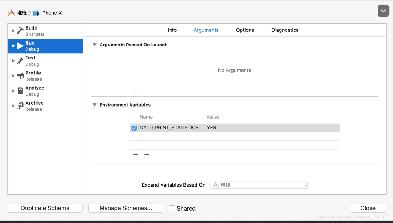 - 在Xcode的菜单中选择Product→Scheme→Edit Scheme...,然后找到 Run → Environment Variables →+,添加name为DYLD_PRINT_STATISTICS值为YSE的环境变量。