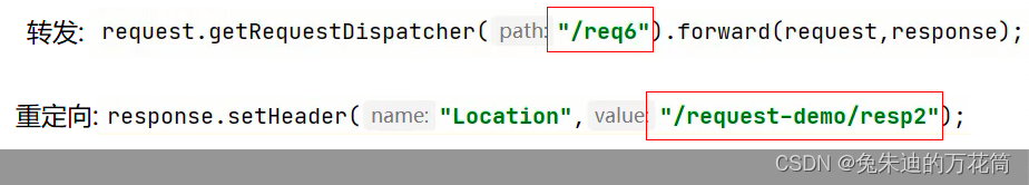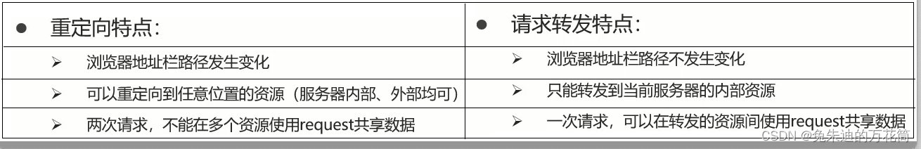 - 是两次请求,不能在多个资源使用request共享数据:因为浏览器发送了两次请求,是两个不同的request对象,不能通过request对象进行共享数据。