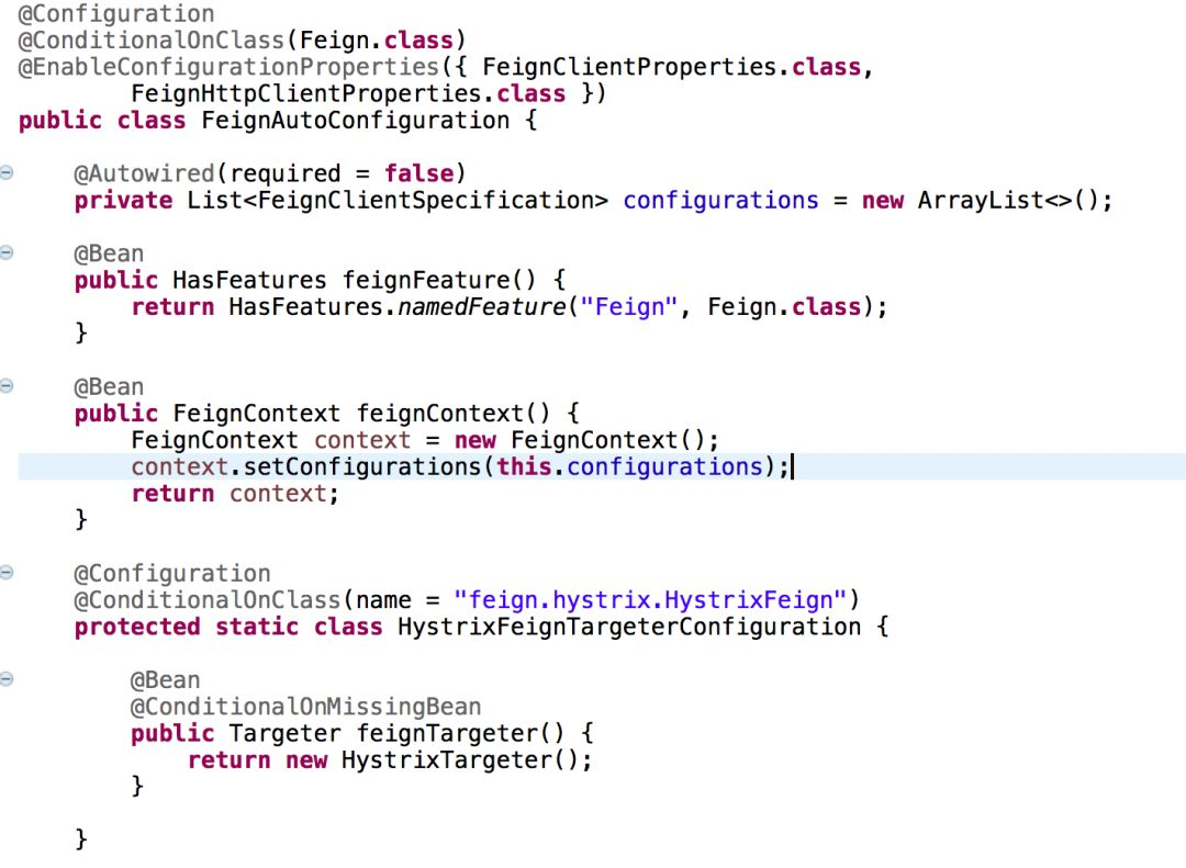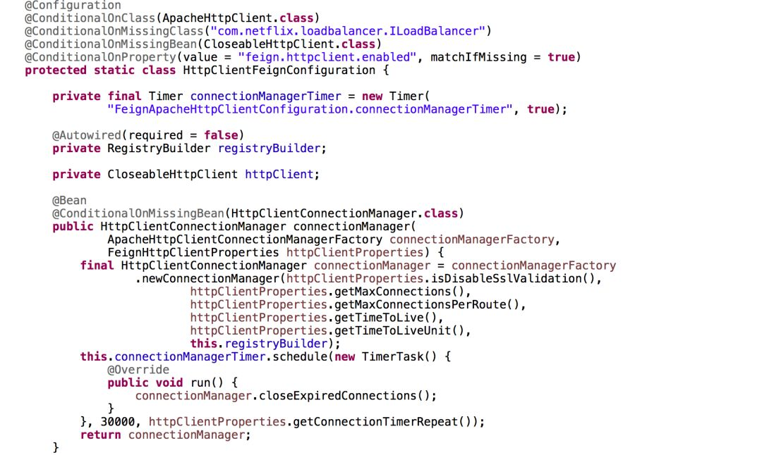 另一种学习的方式就是鼓励大家去看一些框架的源码,特别在 Spring Cloud 这些框架中大量的自动配置,都有用到这些注解,我贴几个图给大家看看。
