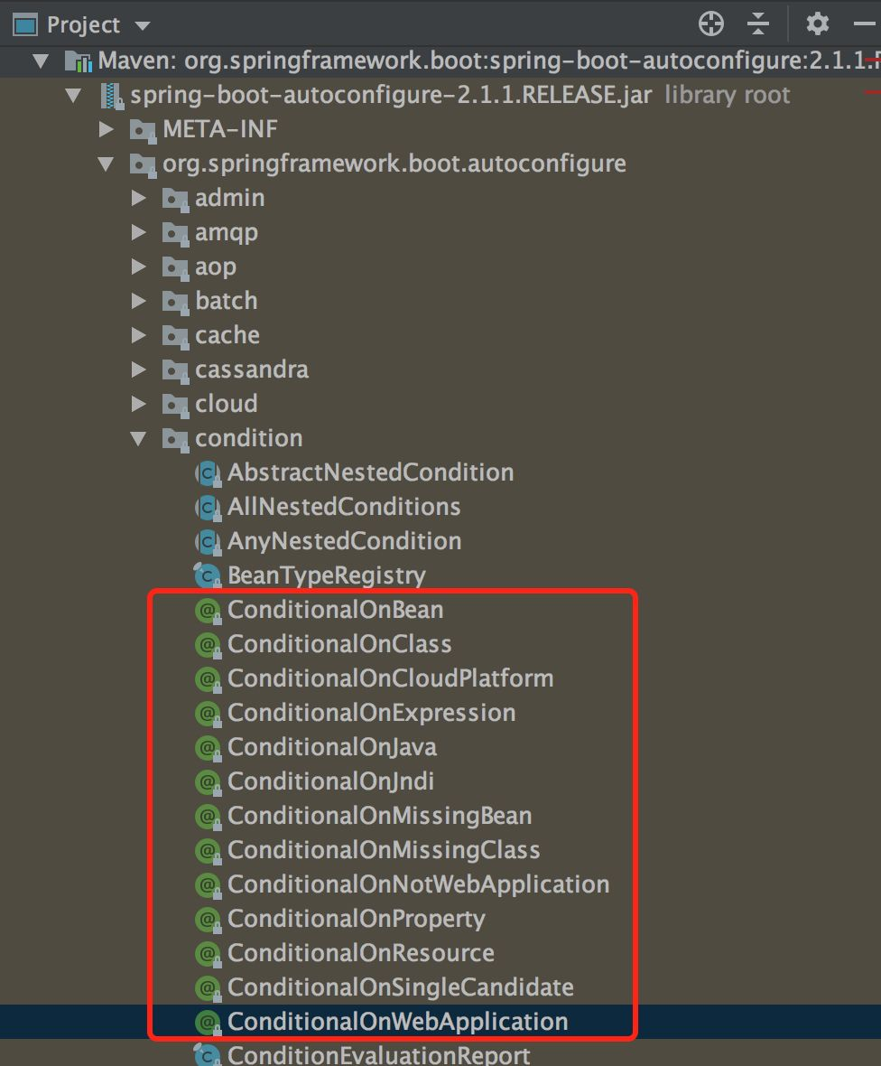 这个时候就可以用到 Spring Boot 为我们提供的 Conditional 家族的注解了,@Conditional 注解会根据具体的条件决定是否创建 bean 到容器中, 如下图: