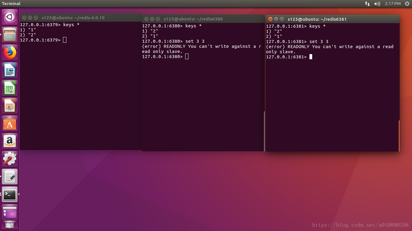 默认情况下Slave是只读模式的,也就是说6380以及6381两台从服务器只能负责读的操作,一旦有写入的行为就会报错。但是可以修改配置文件中slave-read-only来改变它的行为或者通过运行时调用CONFIG SET来随时开启或者关闭。