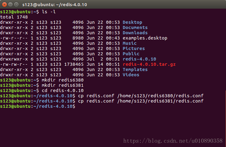 首先创建两个Slave的文件夹以便跟Master区分开,并分别复制一份配置文件redis.conf到各自的文件中: