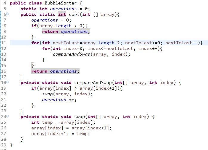 BubbleSorter类知道如何运用冒泡排序算法为一个整数数组排序。BubbleSorter类的sort方法包含了进行冒泡排序的算法。另外两个辅助方法,swap和compareAndSwap,用来处理整数和数组的细节问题以及排序算法需要的一些技术方法。