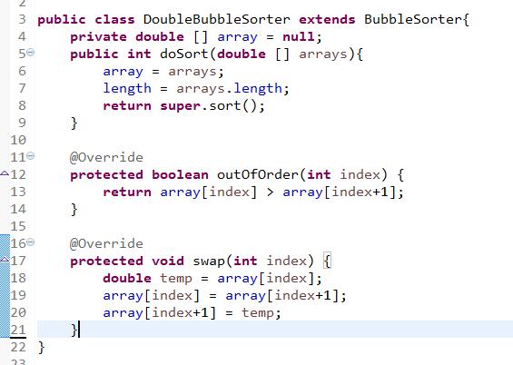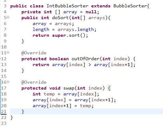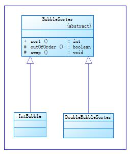 使用模板方法模式,我们可以把具体的冒泡排序算法分离出来,放到一个名为BubbleSorter的抽象基类中。BubbleSorter实现sort方法,sort方法调用名为outOfOrder和swap的抽象方法。这两个抽象方法则又派生类来实现。