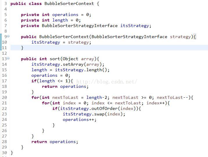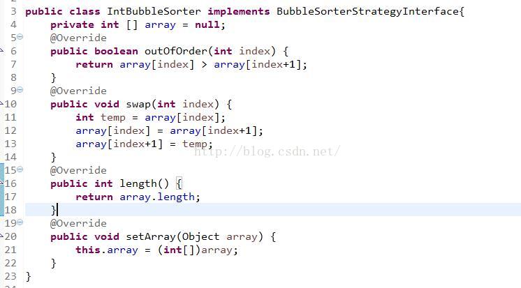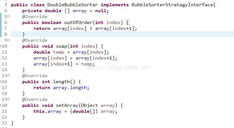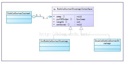 IntBubbleSorterStrategy、DoubleBubbleSorterStrategy:实现抽象策略中的操作,该派生类中含有具体的算法。