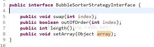 BubbleSorterStrategyInterface:策略、算法家族的抽象,通常为接口,定义每个策略或算法必须具有的方法和属性。