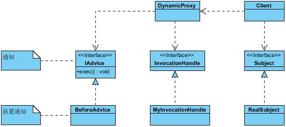 如图,动态代理实现代理的职责,业务逻辑Subject实现相关的逻辑功能,两者之间没有必然的相互耦合的关系。通知Advice从另一个切面切入,最终在高层模块也就是Client进行耦合,完成逻辑的封装任务。