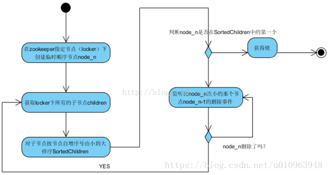 在获取分布式锁的时候在locker节点下创建临时顺序节点,释放锁的时候删除该临时节点。客户端调用createNode方法在locker下创建临时顺序节点,然后调用getChildren(“locker”)来获取locker下面的所有子节点,注意此时不用设置任何Watcher。客户端获取到所有的子节点path之后,如果发现自己创建的节点在所有创建的子节点序号最小,那么就认为该客户端获取到了锁。如果发现自己创建的节点并非locker所有子节点中最小的,说明自己还没有获取到锁,此时客户端需要找到比自己小的那个节点,然后对其调用exist()方法,同时对其注册事件监听器。之后,让这个被关注的节点删除,则客户端的Watcher会收到相应通知,此时再次判断自己创建的节点是否是locker子节点中序号最小的,如果是则获取到了锁,如果不是则重复以上步骤继续获取到比自己小的一个节点并注册监听。当前这个过程中还需要许多的逻辑判断。