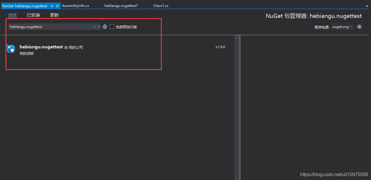 此时在nuget.org和VS中可以搜索并应用自己的包了